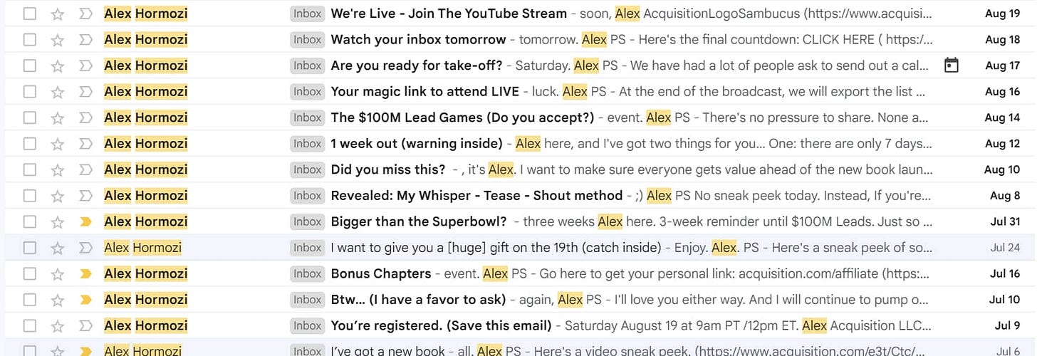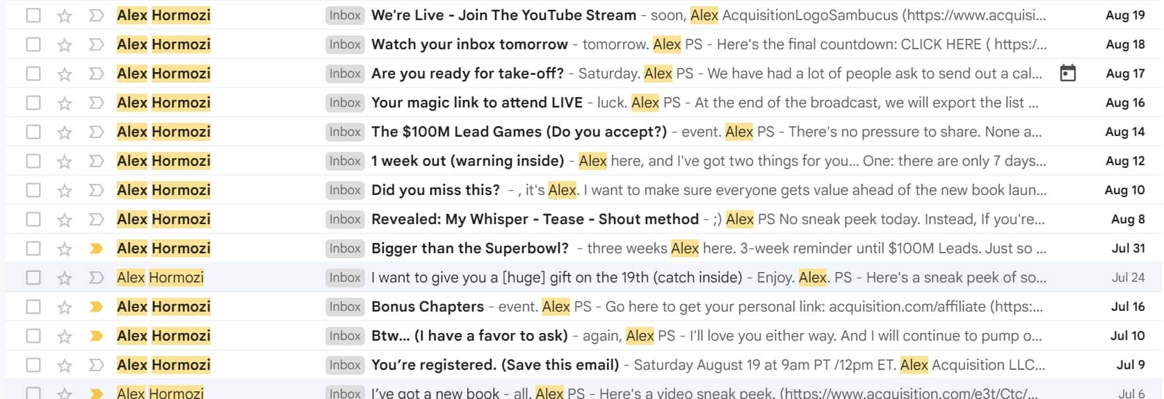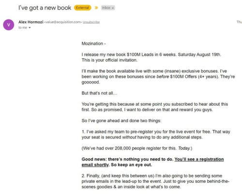 The first email I got had the innocuous title of “I’ve got a new book.” He teased the August 19th, launch, saying “I’ve asked my team to pre-register you for the live event for free.”