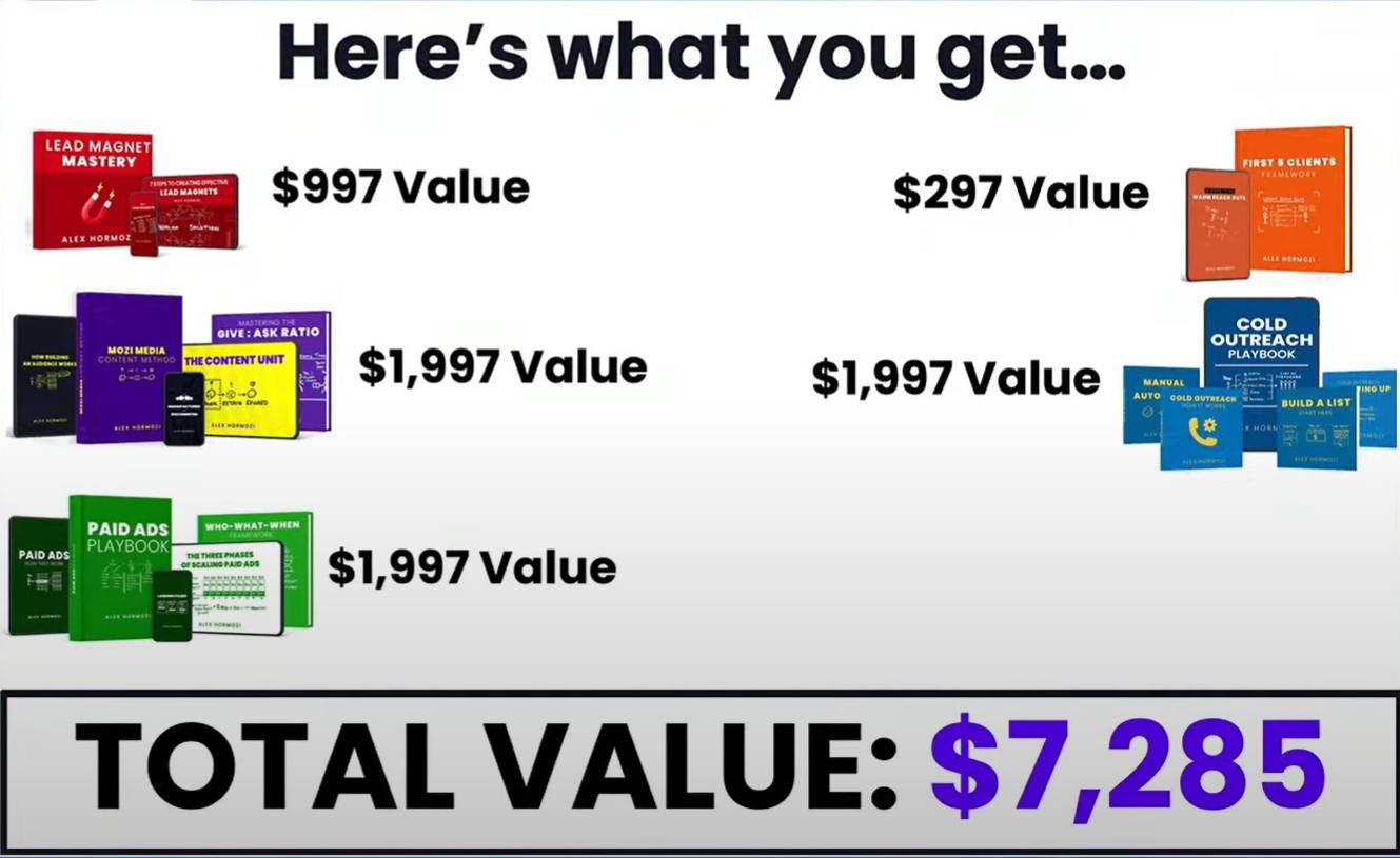 In addition to selling his book (on sale for only $9.99 on Kindle), Hormozi gave away $7,285 worth of extra training materials, plusa free audiobook.